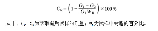 固化度是检验热固性树脂基复合材料的固化质量和制品性能的重要指标。将试样粉未包在滤纸中置于索氏萃取器用沸腾溶剂反复萃取,使树脂中可溶部分萃取出来,不溶部分的树脂则认为已完全固化交联,不溶部分占树脂总量的百分比定义为固化度。按下式计算固化度CR: